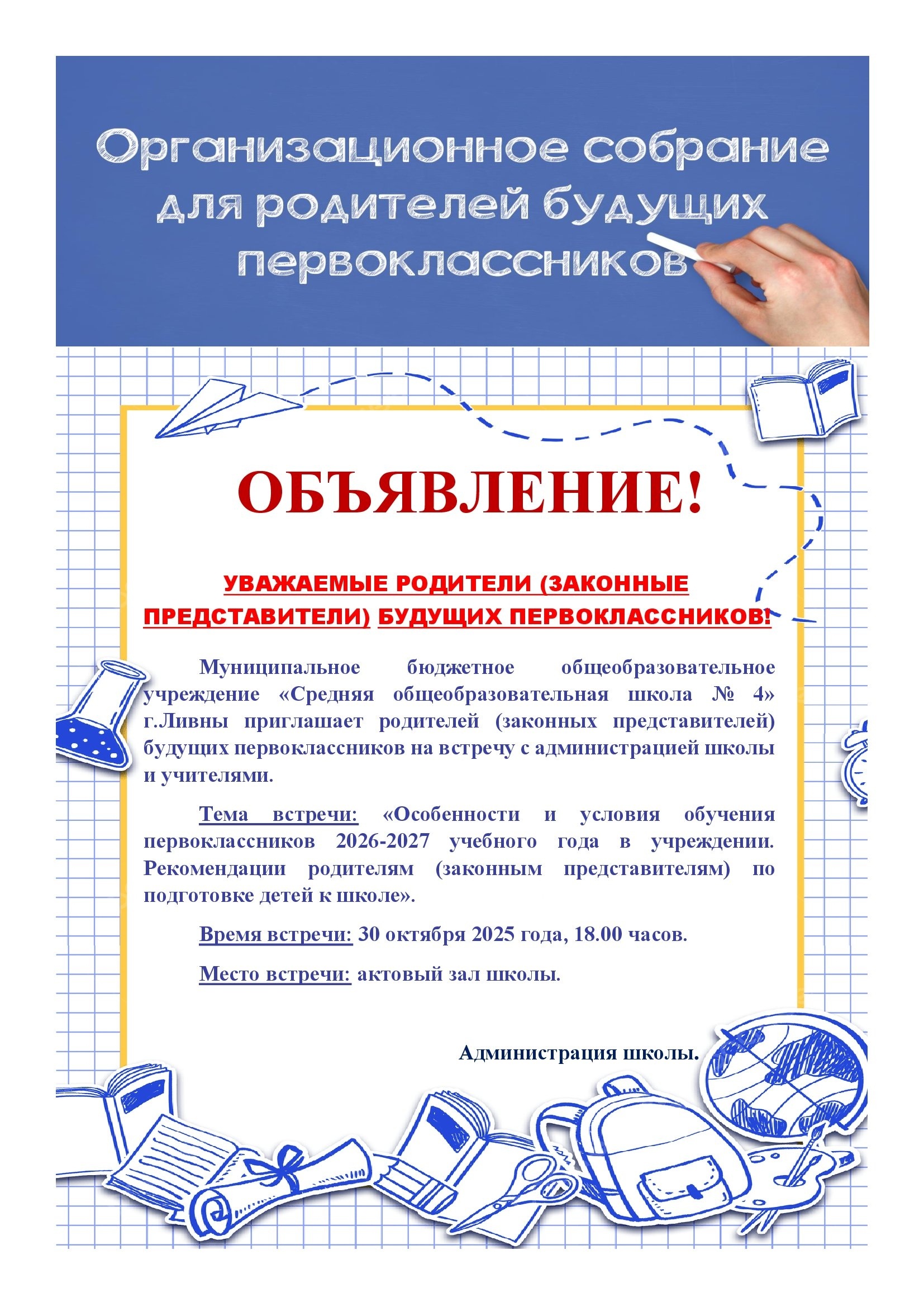 Организационное собрание для родителей (законных представителей) будущих первоклассников МБОУ СОШ № 4 г.Ливны